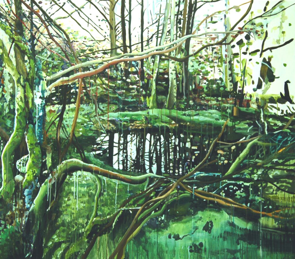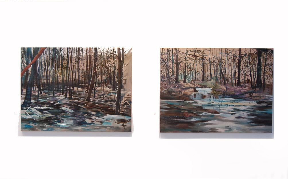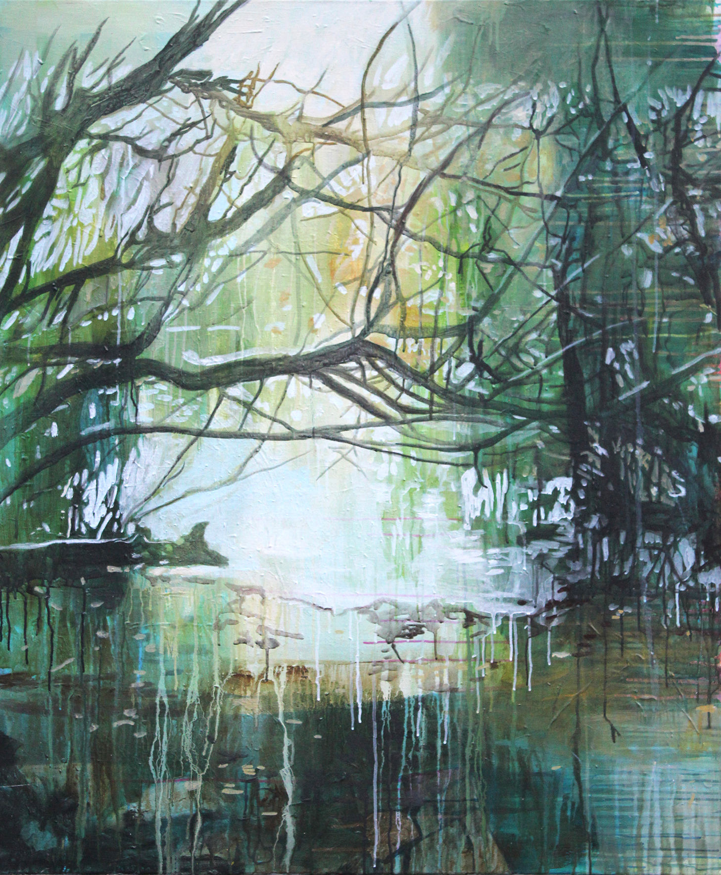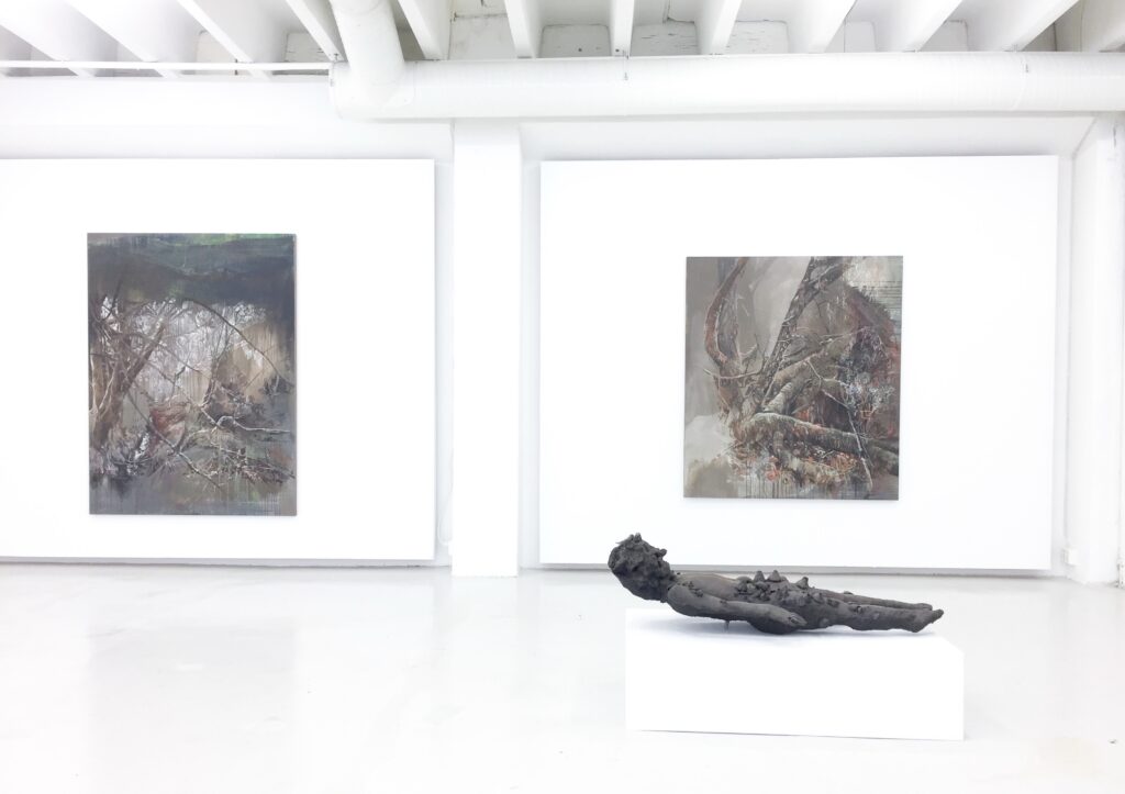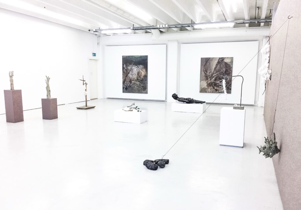 I show acrylic paintings, where the motif is marsh, pond and swamp landscape, which both refer to something mental, mythical, insurmountable, helpless, and stagnant. According to Japanese creation mythology, it is said that in the beginning the world was just a muddy swamp of water and earth. In relation to my paintings, four wax sculptures are presented. They contain a surrealist idiom, but touch on existential themes.” – Inga S. Søreide