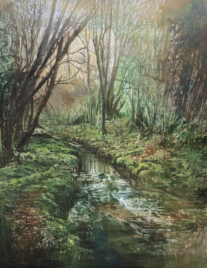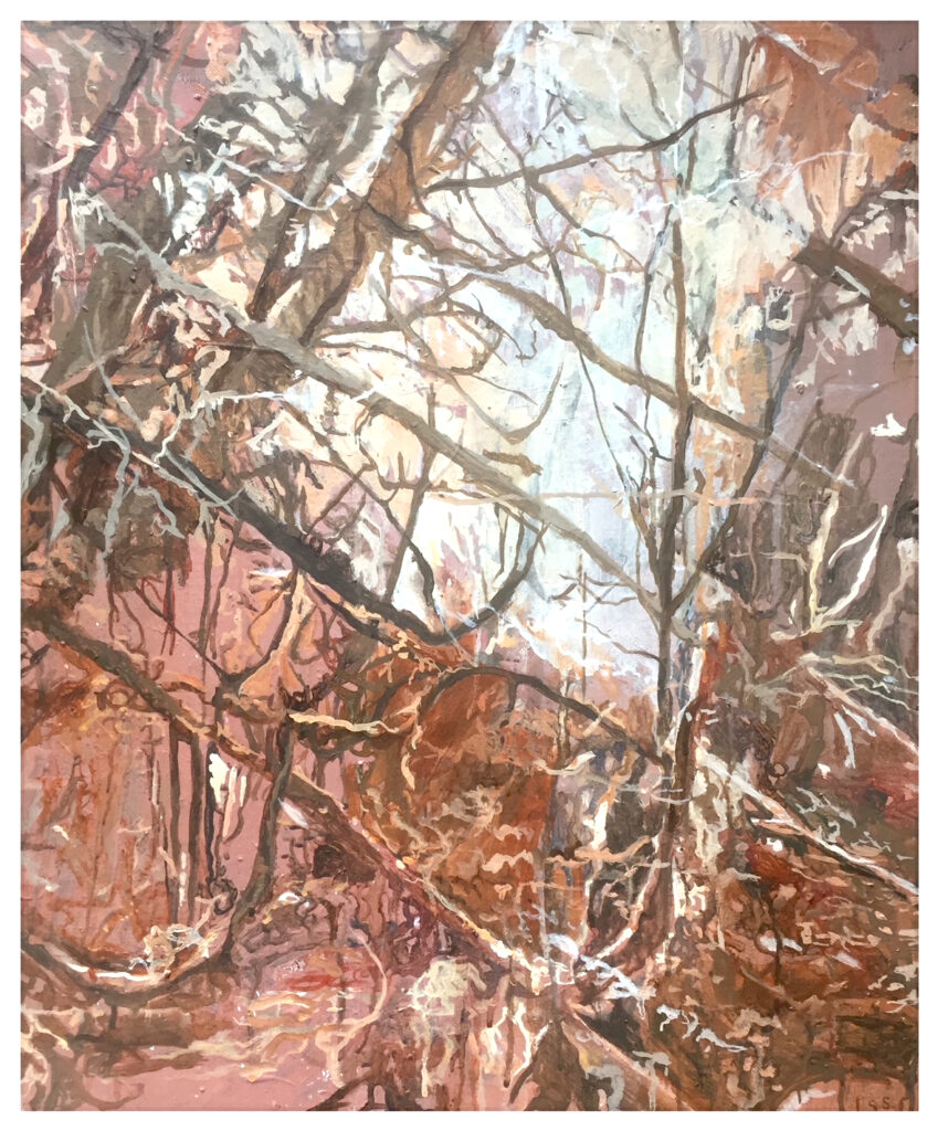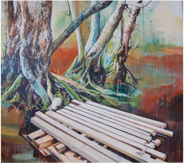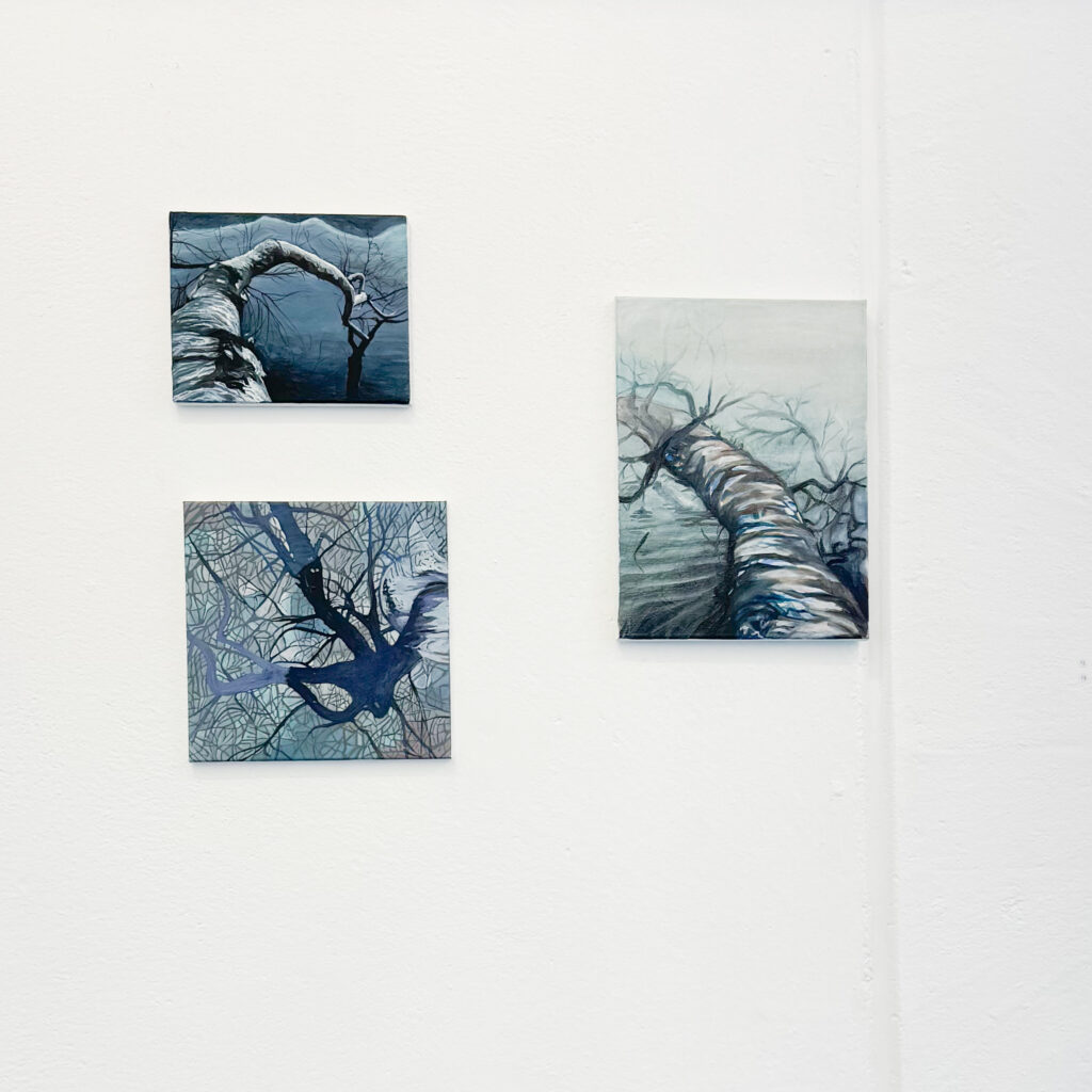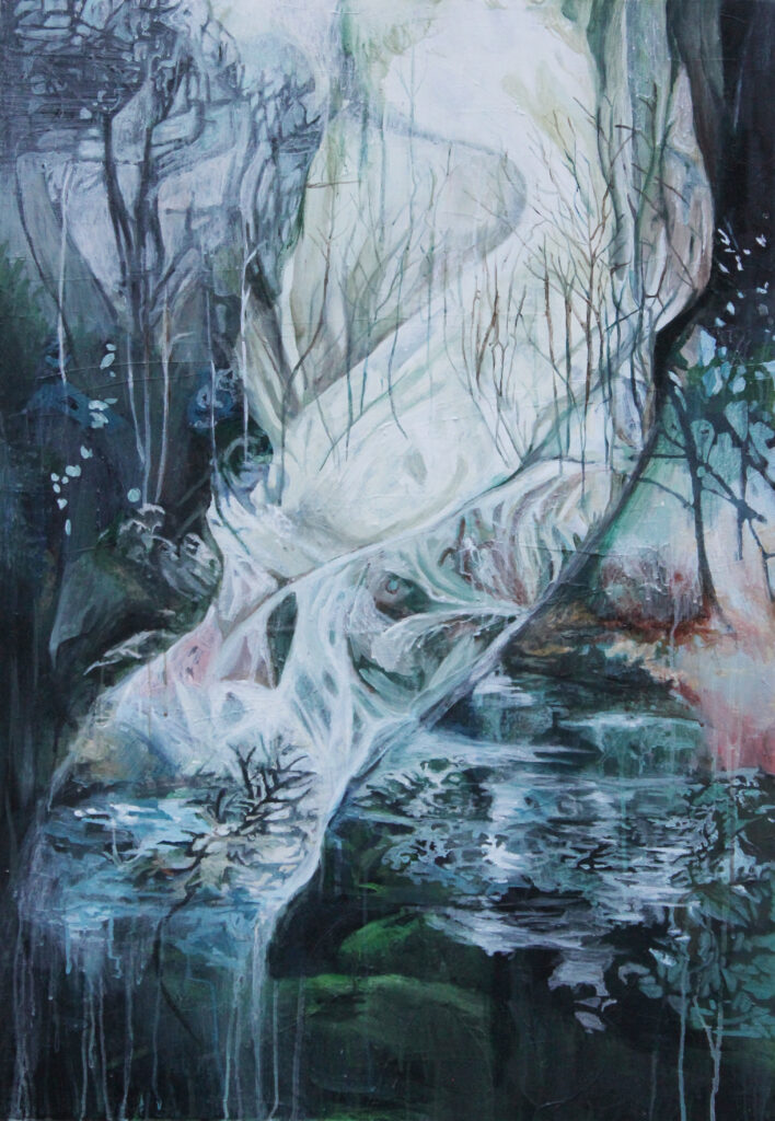 I show acrylic paintings, where the motif is marsh, pond and swamp landscape, which both refer to something mental, mythical, insurmountable, helpless, and stagnant. According to Japanese creation mythology, it is said that in the beginning the world was just a muddy swamp of water and earth. In relation to my paintings, four wax sculptures are presented. They contain a surrealist idiom, but touch on existential themes.” – Inga S. Søreide