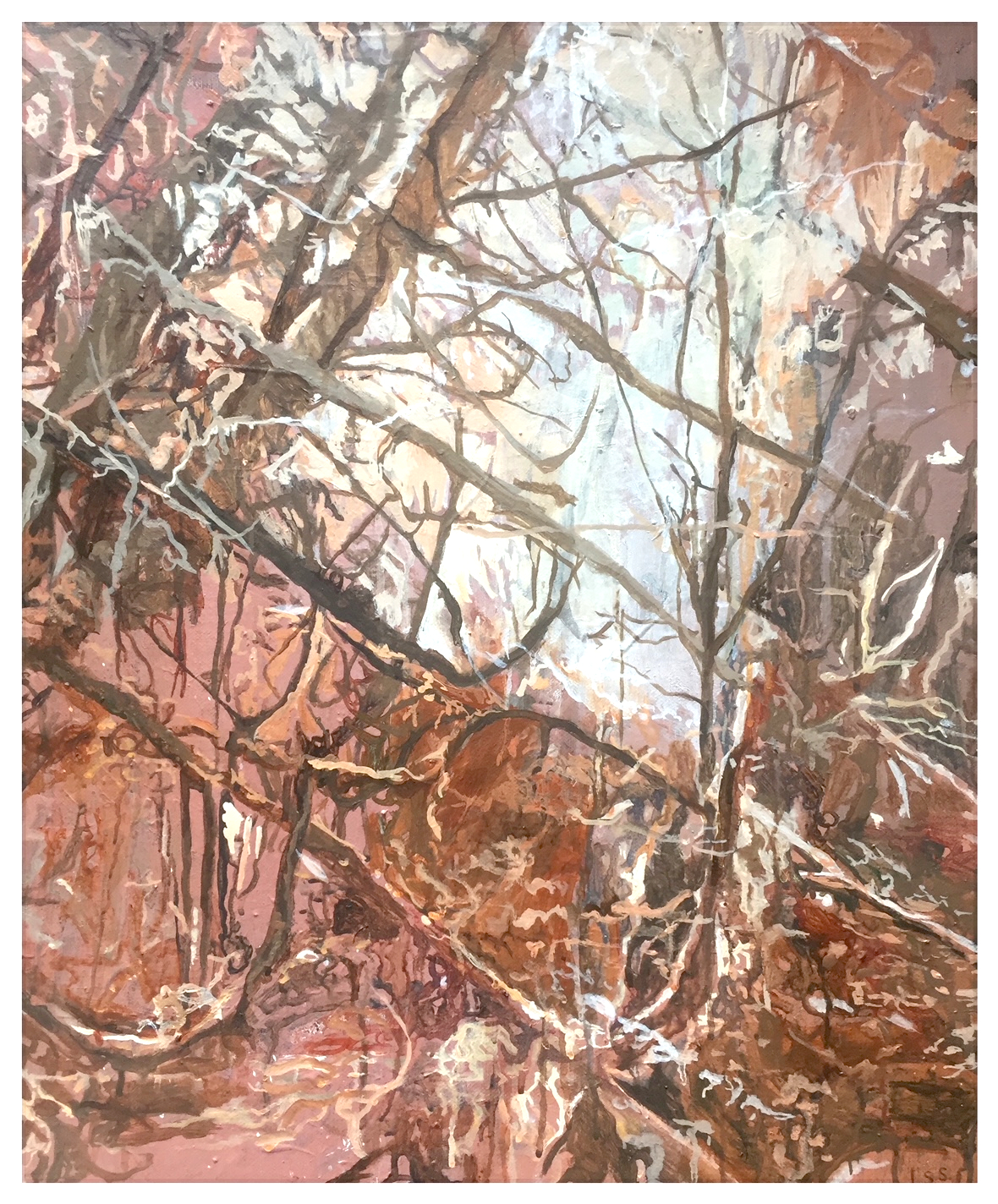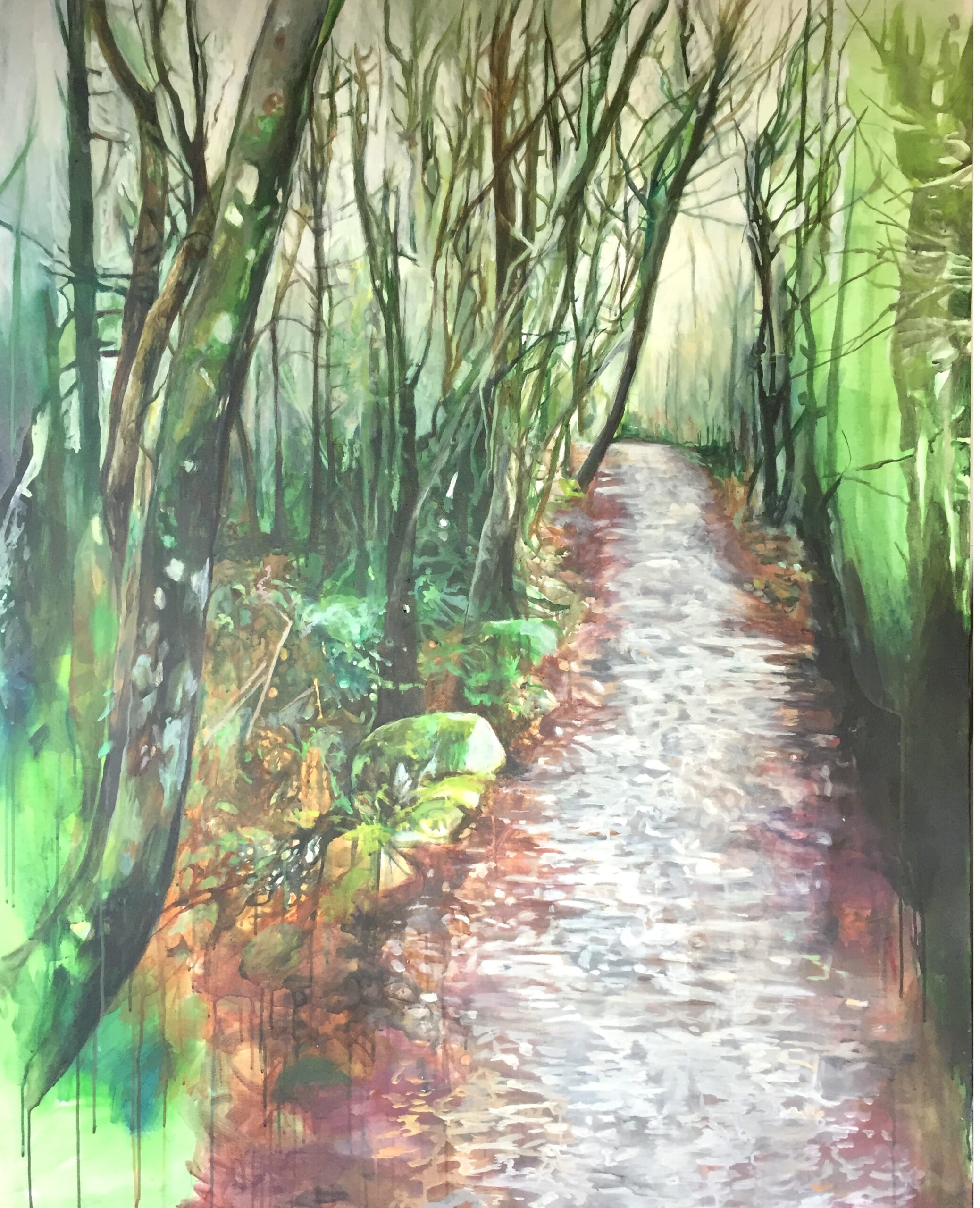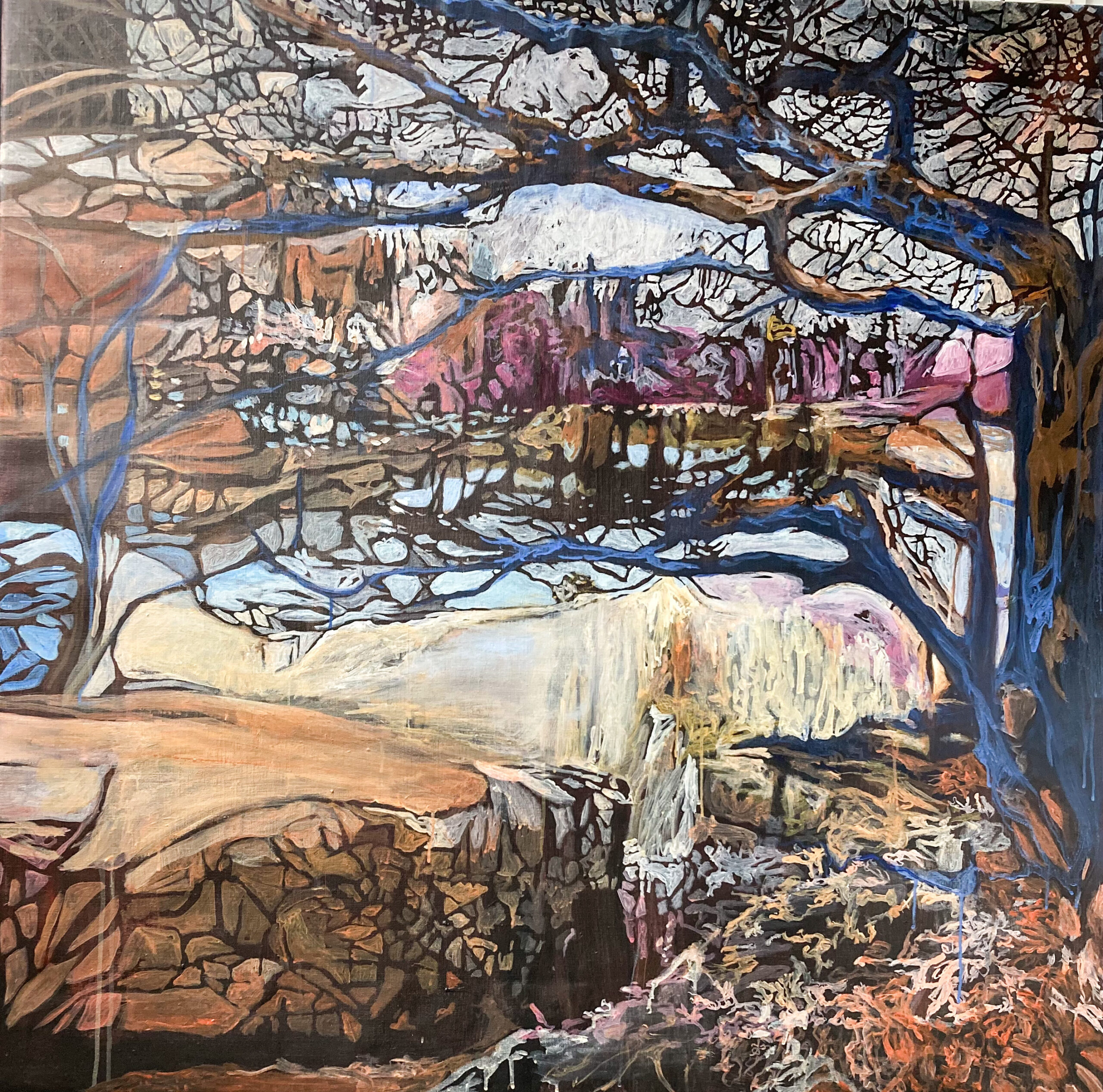 The motifs in the paintings have a motif circle with elements from landscapes and sculptures. The landscapes are taken from memories, where past and present meet. Different layers and parts are combined into new compositions and motifs.