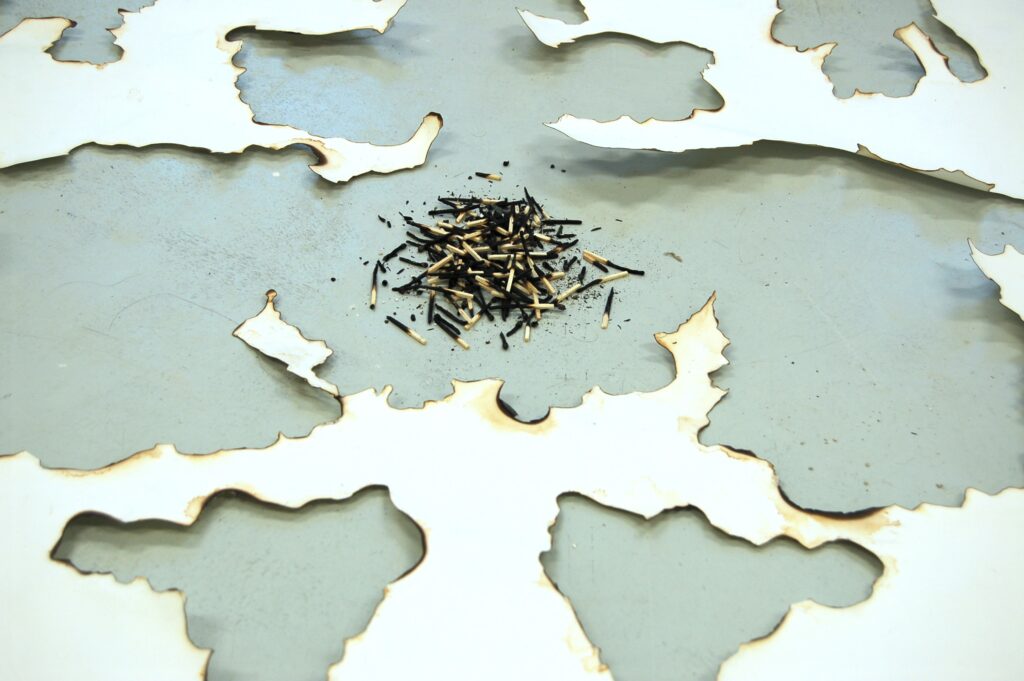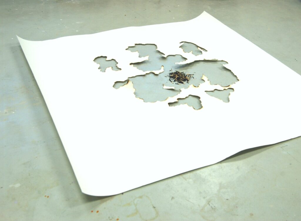 In the drawings, matches and flames are used as tools to burn out Rorschach motifs on paper surfaces. The drawings are an attempt to control and direct fire.