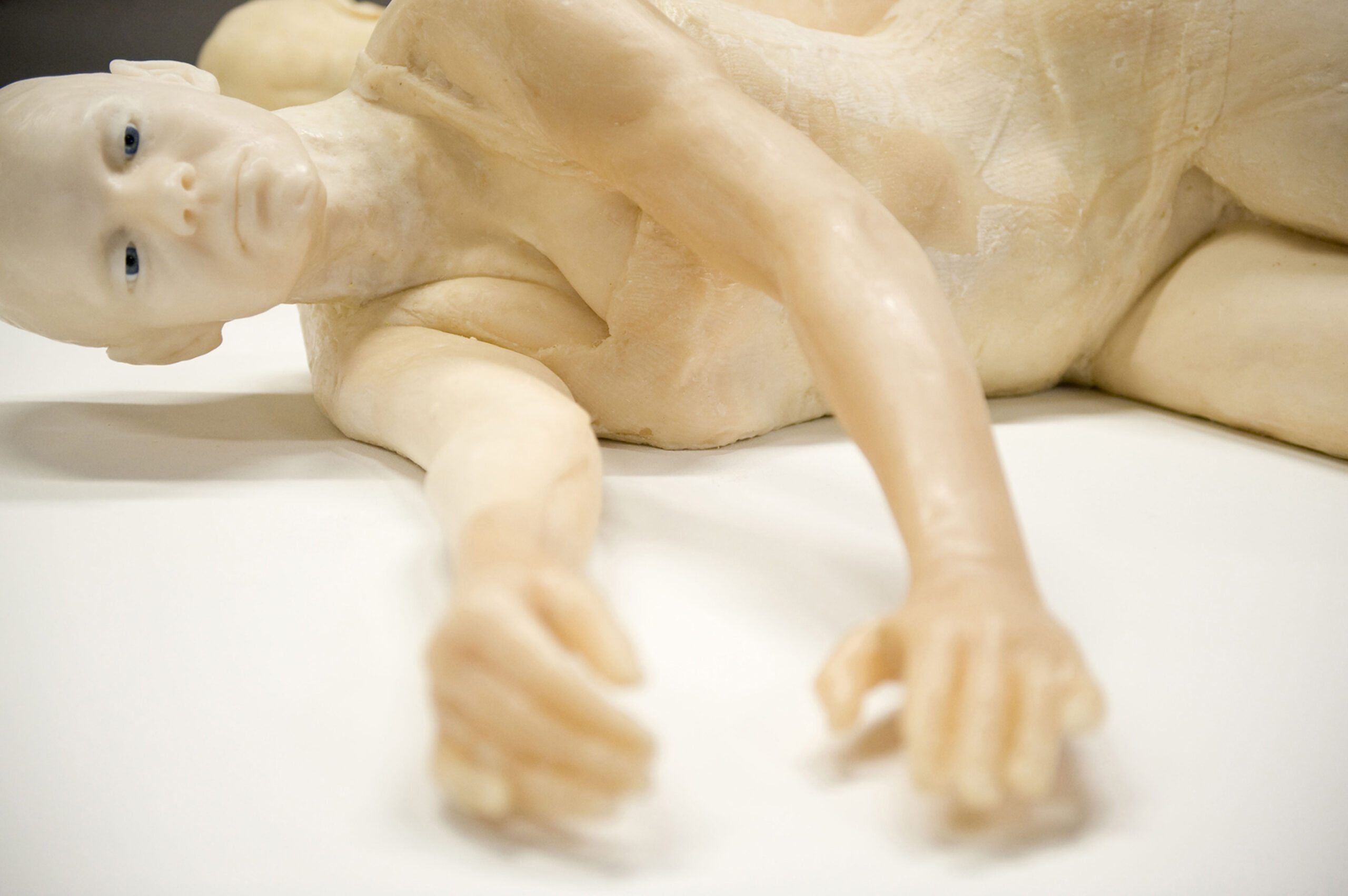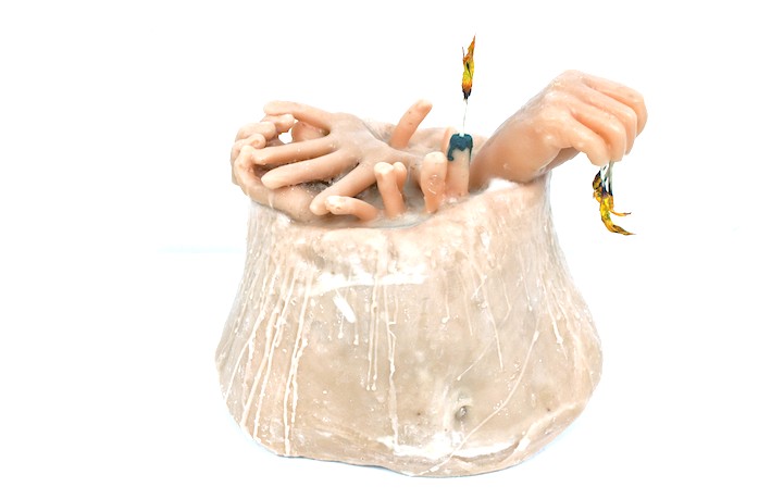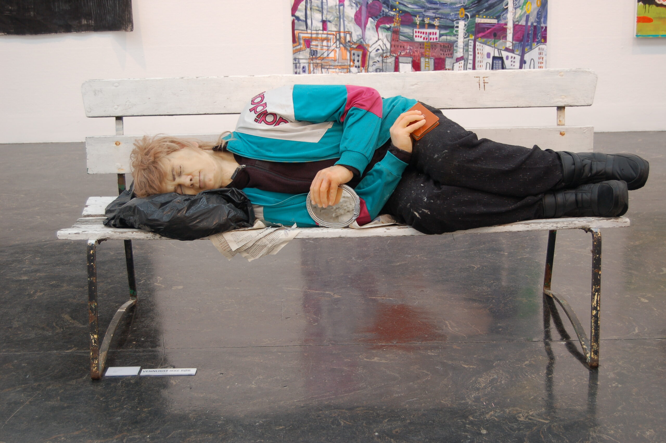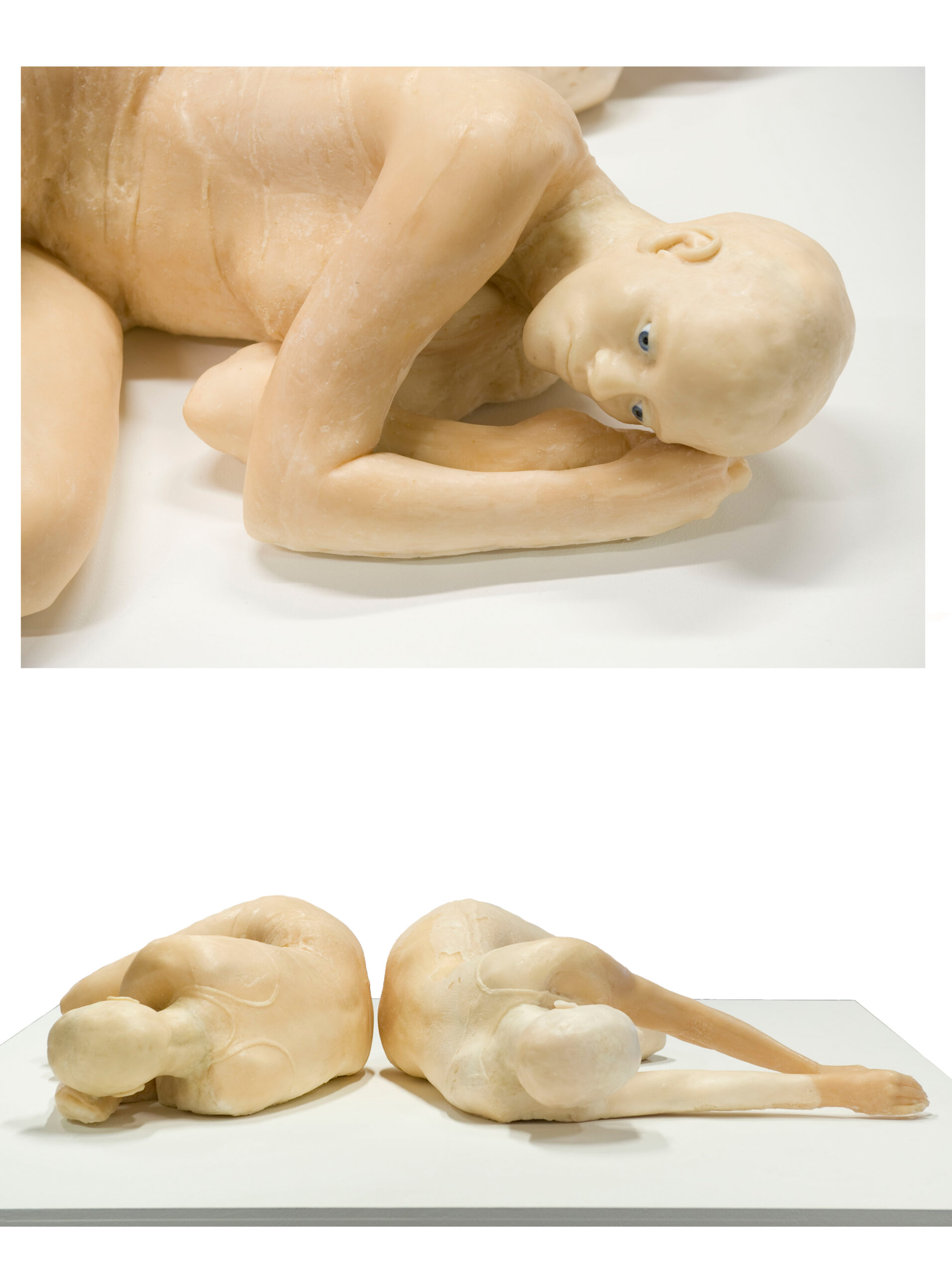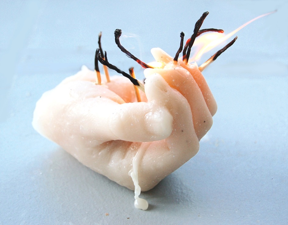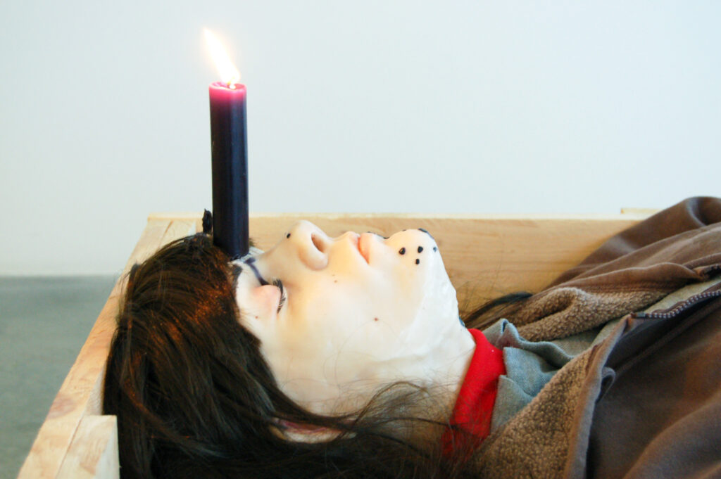 One of the sculptures, Dritt!, shows a head with fluid flowing out of the eye. The work Self-Portrait with Candle shows a wax sculpture that is identical to the artist. A candle is placed on the forehead and burns so that sebum drips down the face.