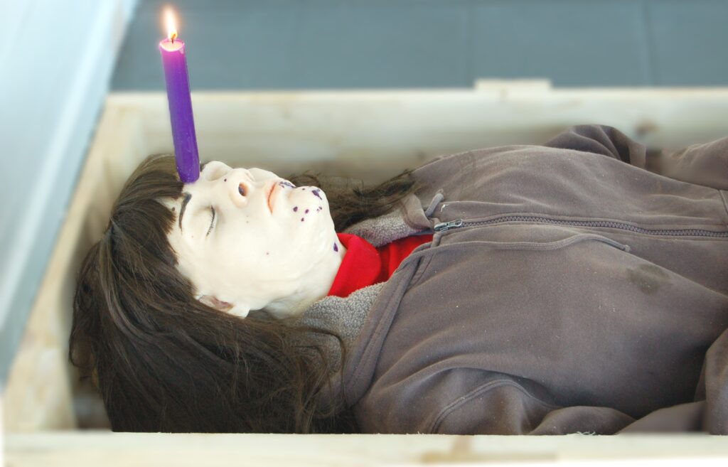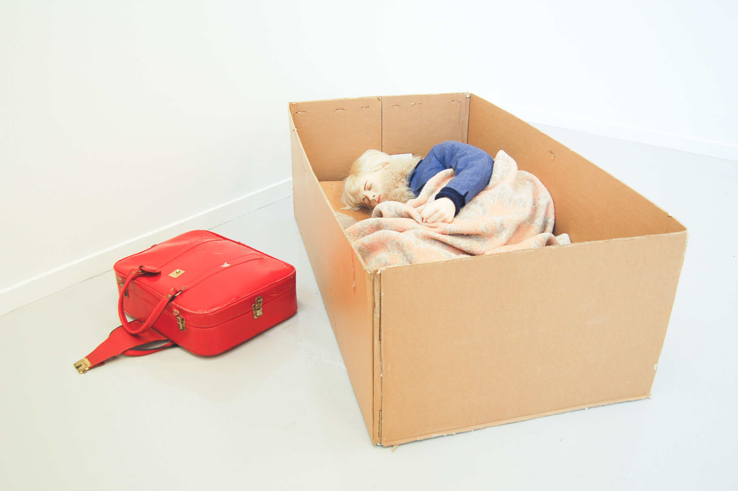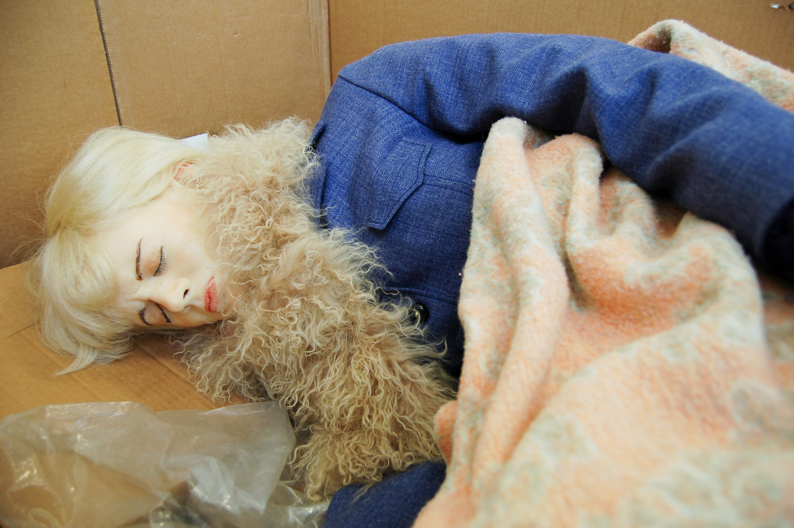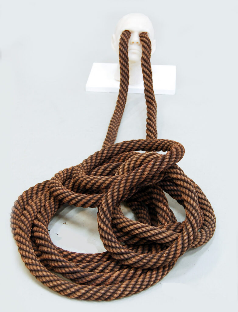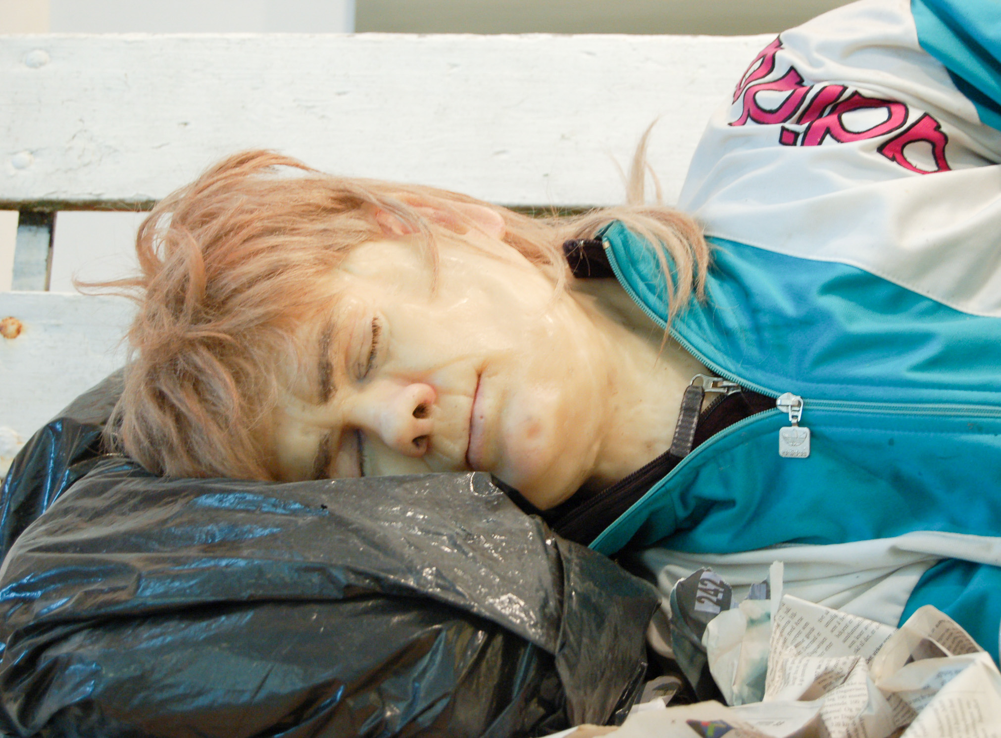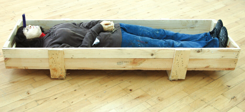 One of the sculptures, Dritt!, shows a head with fluid flowing out of the eye. The work Self-Portrait with Candle shows a wax sculpture that is identical to the artist. A candle is placed on the forehead and burns so that sebum drips down the face.
