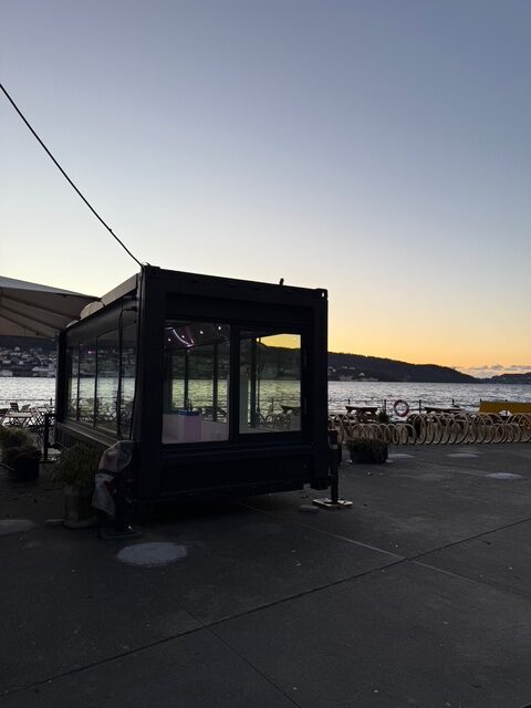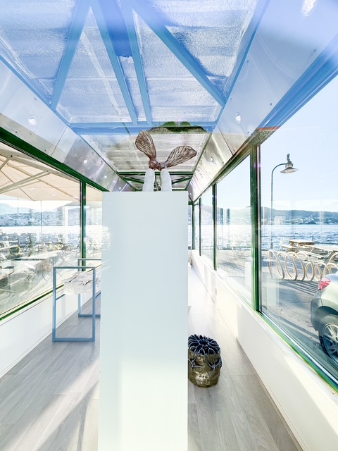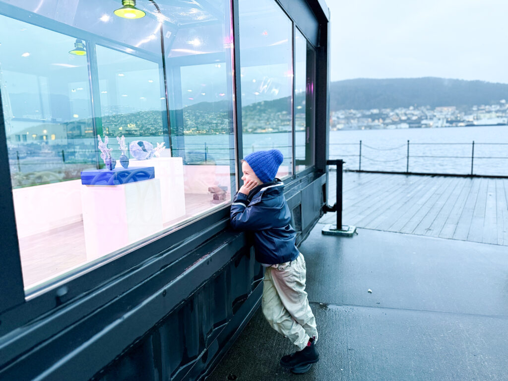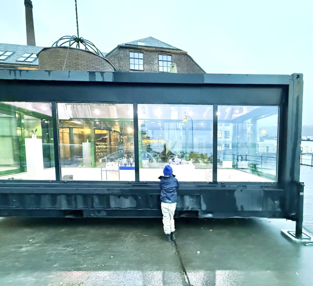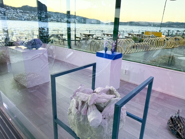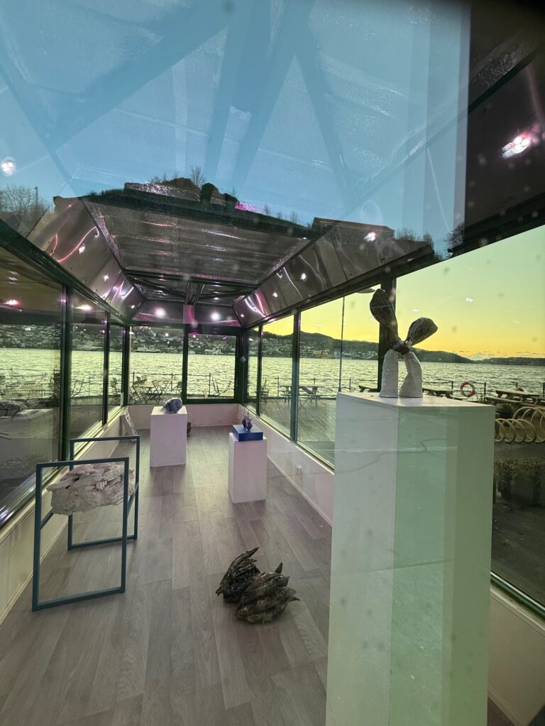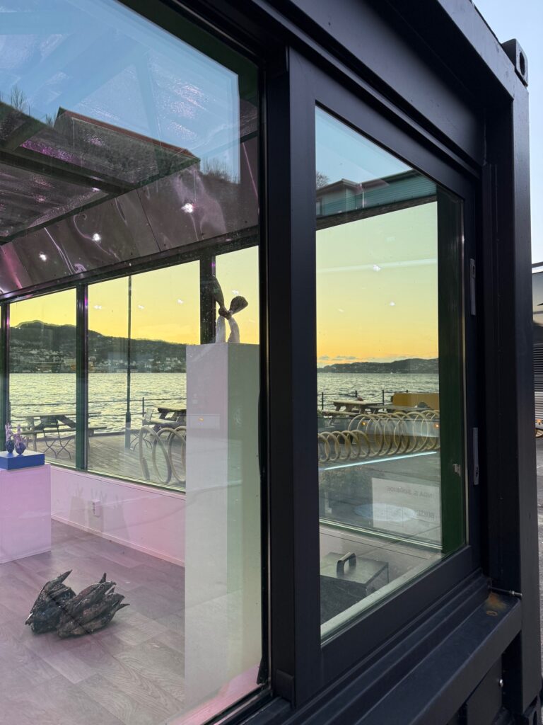 Boksen is a Art display box, a mobile glass container that stands on the dock outside Kafé Kippers and Visningsrommet USF.